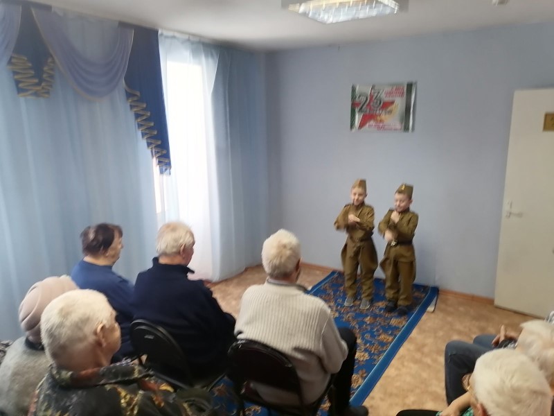 Выступление детей стало приятным подарком и создало радостное настроение. Юные артисты читали стихи, танцевали, пели песни. В свою очередь за чаепитием, ветераны рассказали детям о годах службы в армии, поблагодарили за выступление и угостили детей вкусными конфетами.