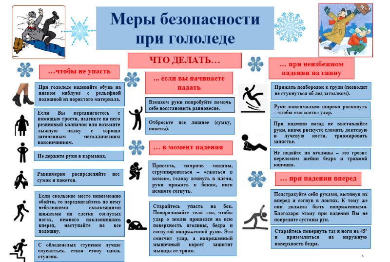Речь шла о том, какие травмы можно получить при падении, как этого избежать и какую первую помощь можно оказать при полученных травмах. Также были разработаны и выданы памятки "О мерах безопасности при гололеде"