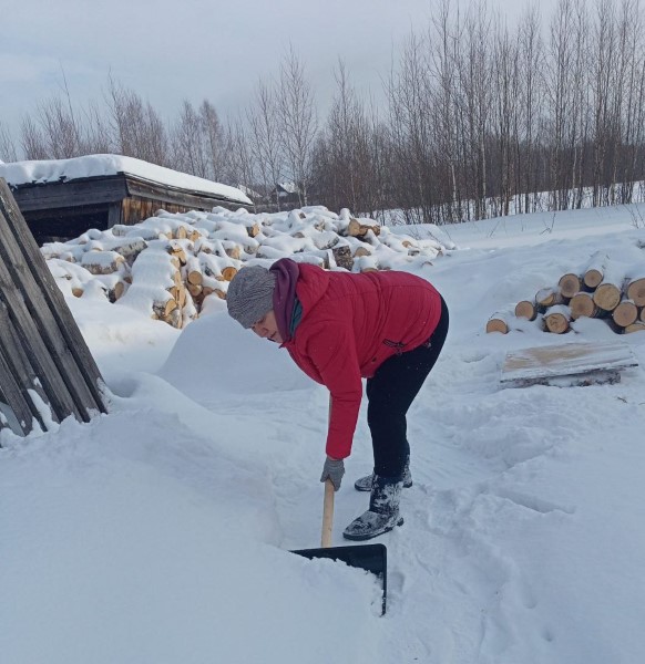 Социальные работники отделения социально-бытового обслуживания на дому №3 Кашаева М.А. и Крылова Н.В. чистят снег у обслуживаемых граждан