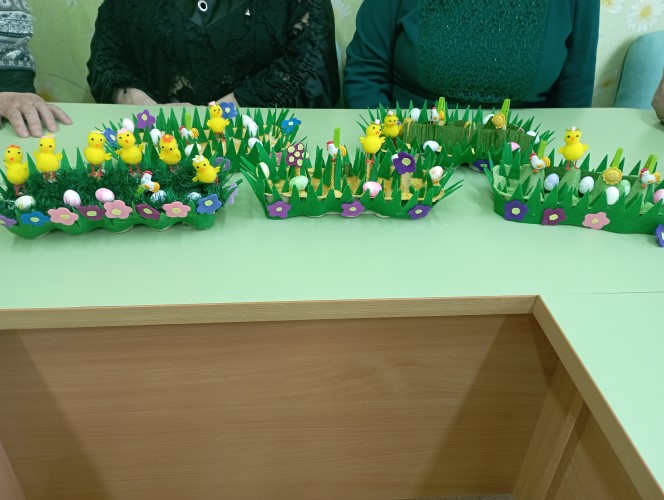 На занятиях по трудотерапии обслуживаемые Отделения дневного пребывания совместно с инструктором смастерили «пасхальную лужайку» из контейнера для яиц. Получилось нарядное украшение к Пасхе. Также в ней можно поднести в подарок пасхальные яйца.