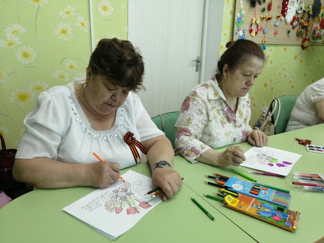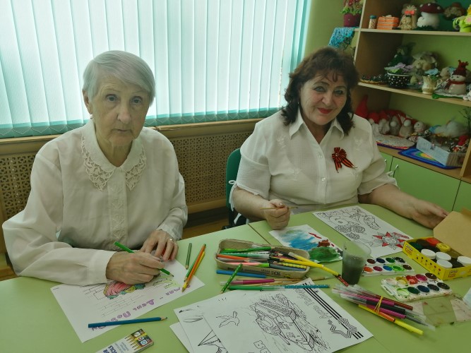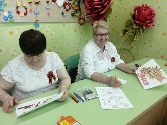 День Победы – праздник всеобщего патриотизма, благодарности поколениям военного времени. Обслуживаемые Отделения дневного пребывания с удовольствием приобщились к оформлению помещения к празднику. На занятии с элементами арт-терапии рисовали рисунки для выставки «Я помню! Я горжусь…». В рисунках изображена символика Победы: гвоздики, салют, вечный огонь, военная техника, солдаты, ордена и медали.