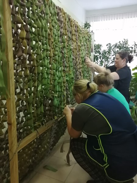 Плести первую сеть в ГБУ «КЦСОН Краснобаковского муниципального округа» начали еще в июне. За это время сотрудники набрались опыта, перепробовали несколько техник и вывели самую удачную. В зависимости от сезона выбираются определенные цветовые сочетания — это важно, ведь сетка должна маскировать. Весят маскировочные сети немного за счёт материалов — используются обычные рыболовные сети и спанбонд.