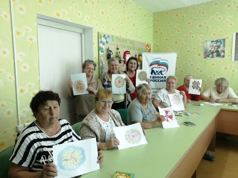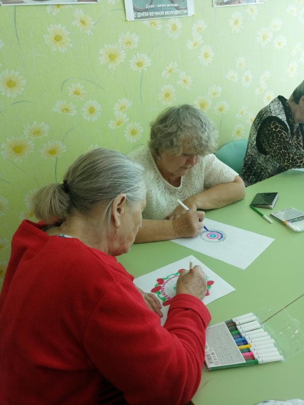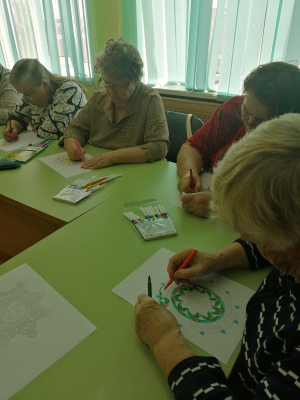 Психолог Алимова С.В. провела занятие по методу «Мандала-терапия» для обслуживаемых Отделения дневного пребывания. Создание мандал представляет собой глубокую работу с бессознательным, способствующую обретению целостности и восстановлению гармонии души. Этот метод является одним из самых мощных и эффективных инструментов, дарующих человеку жизненные силы. Мандала-терапия — это безопасный и естественный способ изменения психо-эмоционального состояния, снятия напряжения и выражения чувств, который способствует развитию саморегуляции. Метод настолько прост и эффективен, что его легко осваивают пожилые люди и люди. Перед началом занятия психолог провела краткий обзор метода, рассказала о его целях и задачах. В процессе рисования каждый участник дал название своей работе. В завершение занятия состоялась обязательная интерпретация всех рисунков и обсуждение самых интересных случаев. Все присутствующие отметили, что после занятия у них повысилось настроение и снизилось чувство внутренней тревожности. Кроме того, они выразили желание применять полученные знания в будущем и продолжать практиковаться в рисовании мандал дома.