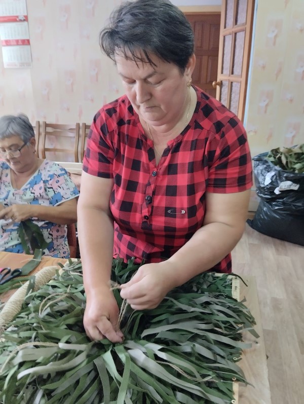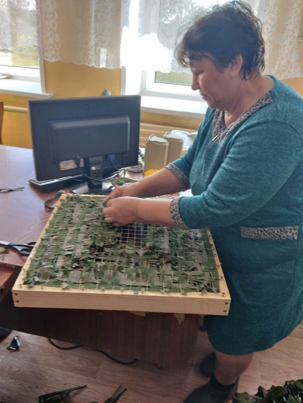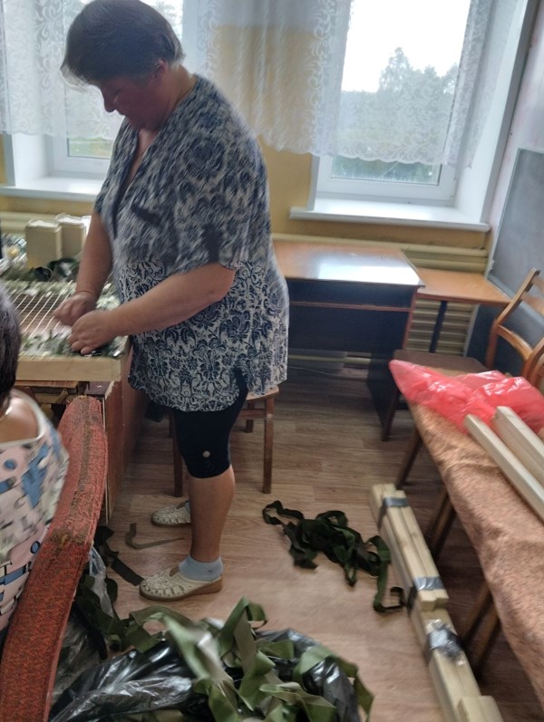 Социальные работники отделения социально-бытового обслуживания на дому с. Кириллово принимают активное участие в плетении маскировочных нашлемников для СВО