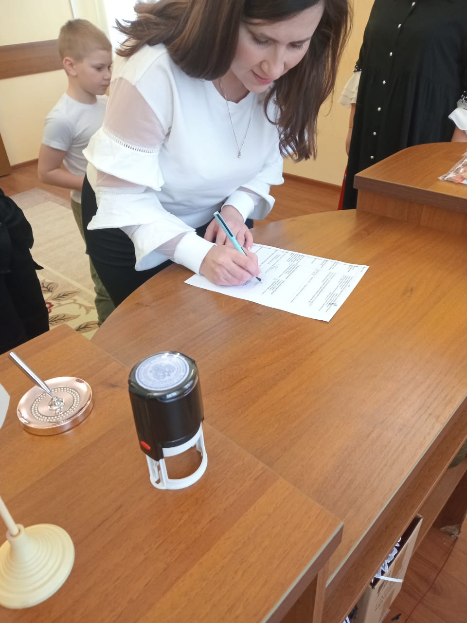 С радостным событием родителей малыша поздравила Заведующая ЗАГС Титова С.И. вручила счастливой маме новорожденного его первый документ-свидетельство о рождении и именную ложечку.А также