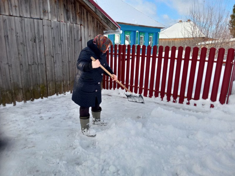 Социальные работники отделения социально-бытового обслуживания на дому №3 Кашаева М.А. и Крылова Н.В. чистят снег у обслуживаемых граждан