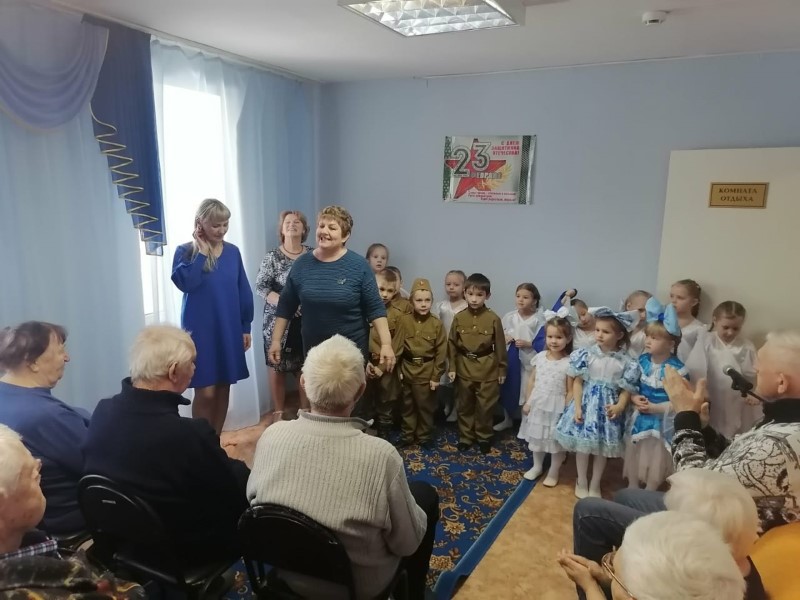 Выступление детей стало приятным подарком и создало радостное настроение. Юные артисты читали стихи, танцевали, пели песни. В свою очередь за чаепитием, ветераны рассказали детям о годах службы в армии, поблагодарили за выступление и угостили детей вкусными конфетами.