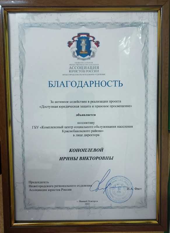 21.12.2022 в г. Нижний Новгород в Большом зале Торгово-промышленной палаты Нижегородской области состоялся научно-практический круглый стол "Правовые проблемы защиты прав и свобод пенсионеров". Мероприятие посвящено подведению итогов реализации проекта - победителя конкурса Президентских грантов "Доступная юридическая защита и правовое просвещение". Государсмтвенное бюджетное учреждение "Комплекснывй центр социального обслуживания населения Краснобаковского района" принимало участие в данном проекте и награждено Благодарностью за активное содействие и реализации проекта.