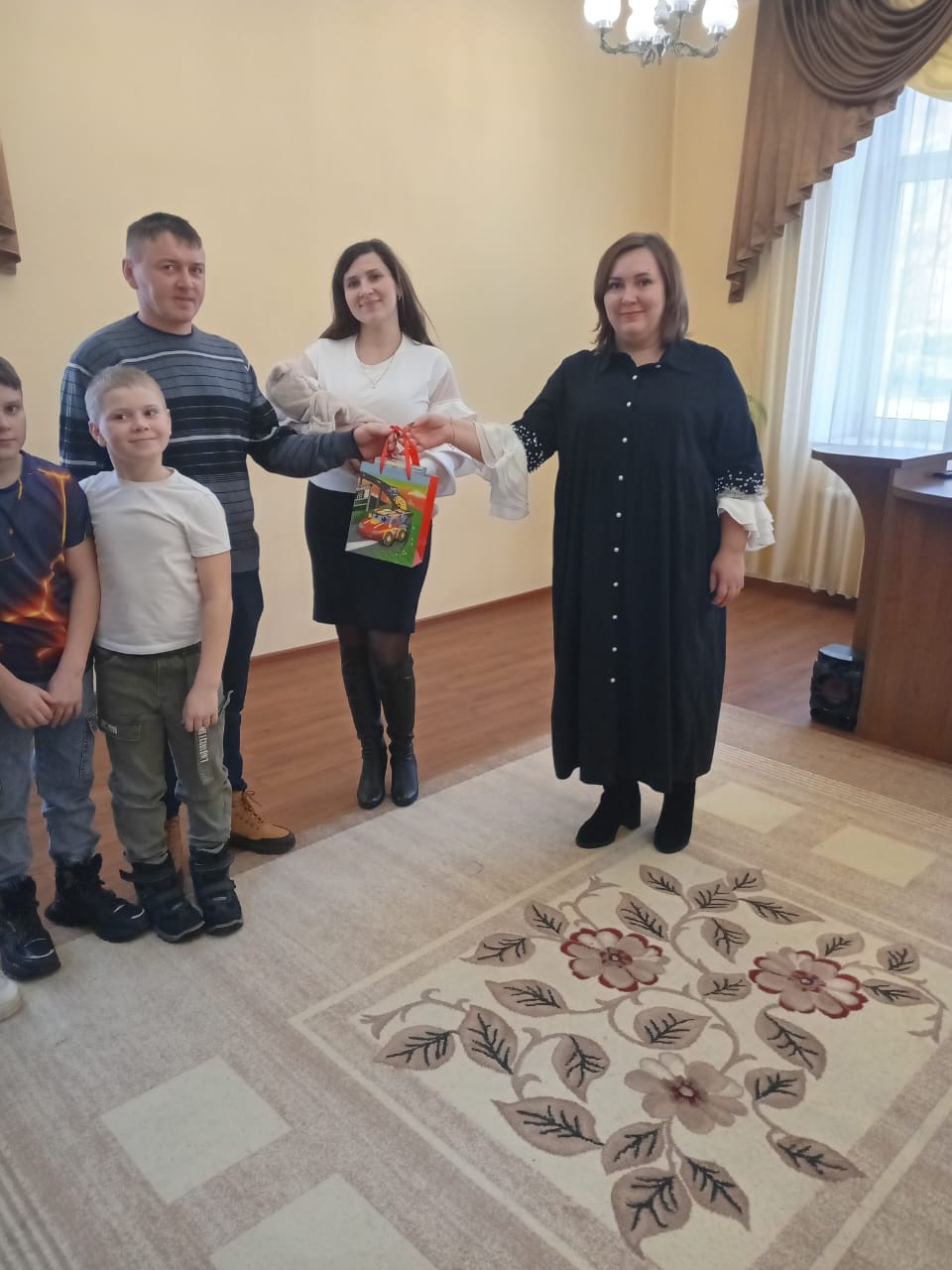 С радостным событием родителей малыша поздравила Заведующая ЗАГС Титова С.И. вручила счастливой маме новорожденного его первый документ-свидетельство о рождении и именную ложечку.А также