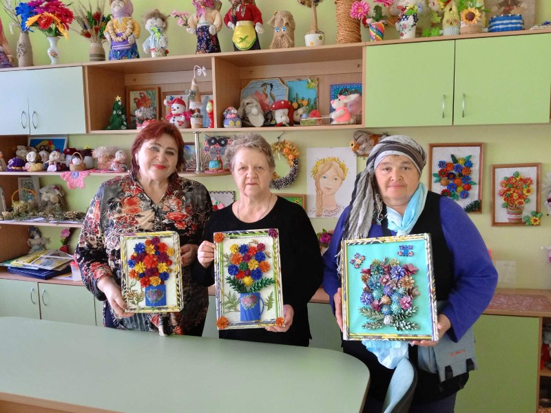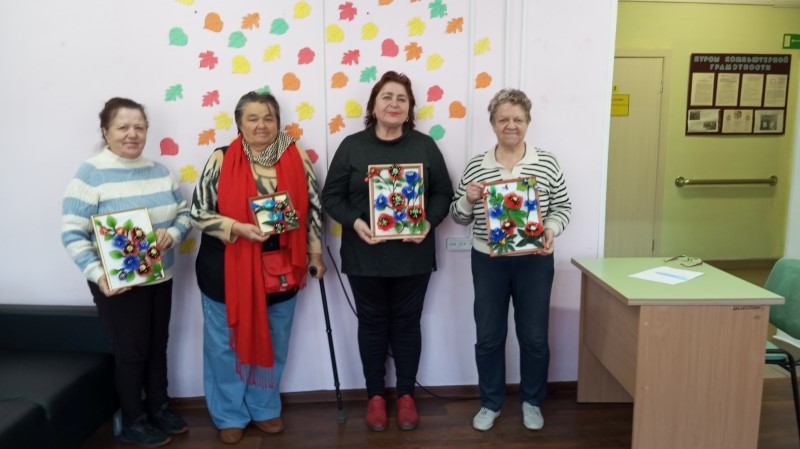 Обслуживаемые дневного отделения ГБУ КЦСОН Краснобаковского муниципального округа под руководством инструктора Науменко Т.В. на занятиях по трудотерапии изготовили осенние цветочные панно из шишек.