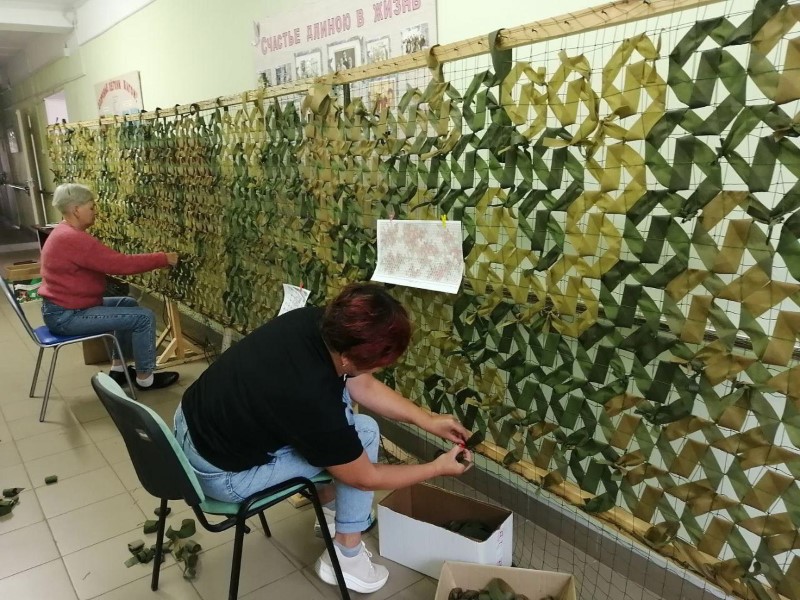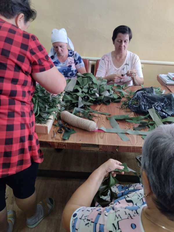 Социальные работники отделения социально-бытового обслуживания на дому с. Кириллово принимают активное участие в плетении маскировочных нашлемников для СВО