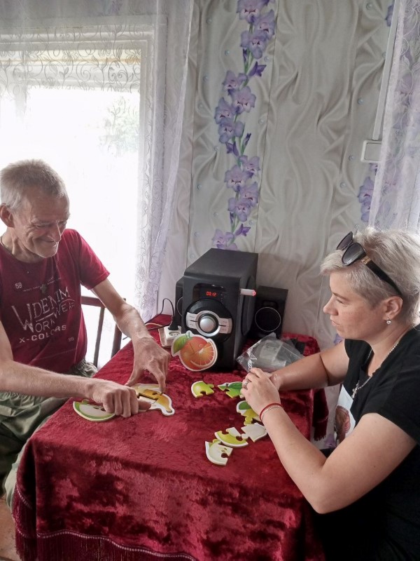 Заведующая отделением социально-бытового обслуживания на дому с. Носовая Цветова С.Л. провела занятия с обслуживаемыми. Тематика занятия - развитие памяти и мелкой моторики рук: "Домино для развития памяти "Герои из сказки", "Пазлы".